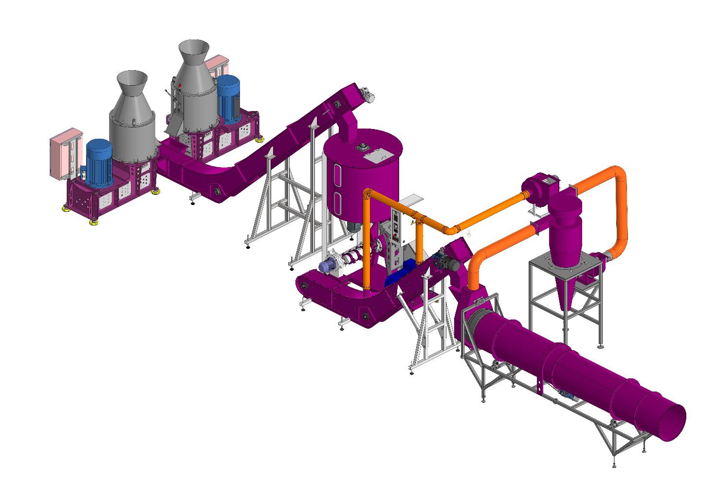 - первое звено технологической линии предназначено для первичной обработки сырья и выполняет одновременно операции: измельчение, смешивание и сушку. Благодаря этому линия имеет меньшее количество узлов.